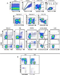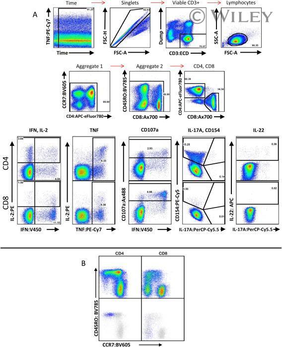 - Example staining of adult human PBMC following stimulation. ( A ) The first two rows demonstrate the gating hierarchy from total sample to CD4/CD8 identification. A time gate is used to exclude pressure aberrations from the cytometer that may have occurred during sample acquisition. Aggregate gates are used to exclude brightly positive events that may result from antibody or cell aggregation. The bottom row demonstrates gating for cytokines and functions from CD4+ (top half) and CD8+ (bottom half) events resulting from stimulation with Staphylococcal enterotoxin B . Note that IL-17A and CD154 were gated on the same plot to avoid mischaracterization resulting from the increased spectral overlap observed from their fluorochromes. ( B ) Example plots showing memory profile of CCR7 versus CD45RO in CD4+ and CD8+ populations. Using CMV pp65 peptide pool-stimulated PBMC from a CMV-reactive donor, IFN-gamma+ events (blue) were overlaid onto these plots (gray), confirming localization of these events to the effector memory and effector compartments.