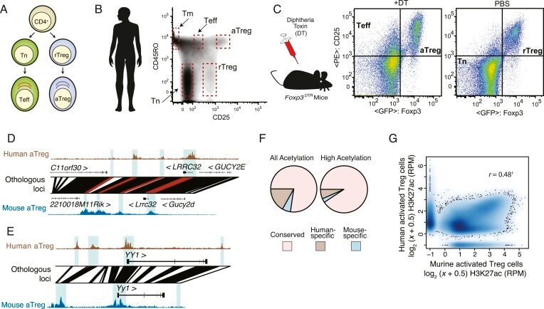 - Figure 1. Analysis of genetic and epigenetic conservation in mouse and human Treg and CD4 + T cell subsets. ( A ) Schematic representation of profiled CD4 + T-cell subsets. Abbreviations: naive T cell (Tn); effector T cell (Teff); resting regulatory T cell (rTreg); activated regulatory T cells (aTreg). ( B ) The indicated human CD4 + T-cell subpopulations were FACS sorted based on CD3 , CD4, CD45RO, and CD25 expression from preparations of peripheral blood mononuclear cells (PBMCs) from healthy human donors. Highly purified Treg cell subpopulations were obtained using a FACS Aria II fluorescent cell sorter ( Figure 1-figure supplement 1A ). Epigenetic profiling was performed using the following 16 cell samples isolated from 7 healthy donors: including 7 aTreg, 4 rTreg, 2 Teff, 2 Tmem, and 1 Tn independently isolated cell populations. See also Figure 1-figure supplement 1A,B . ( C ) Resting and activated murine CD4 + T-cell subpopulations were FACS sorted from Foxp3 DTR-GFP mice injected with PBS or diphtheria toxin (DT), respectively. In Foxp3 DTR-GFP mice, Treg cells express diphtheria toxin receptor (DTR). Mice injected with DT underwent punctual Treg cell depletion and consequent transient systemic inflammation, which resulted in activation of rebounding Treg and conventional T cells. A total of 10 mouse cell samples isolated using FACS sorting from DT-treated and DT-untreated Foxp3 DTR mice were analyzed: 2 aTreg, 4 rTreg, 2 Teff, and 4 Tn biological replicates. ( D , E )