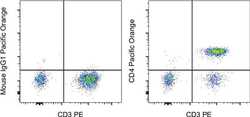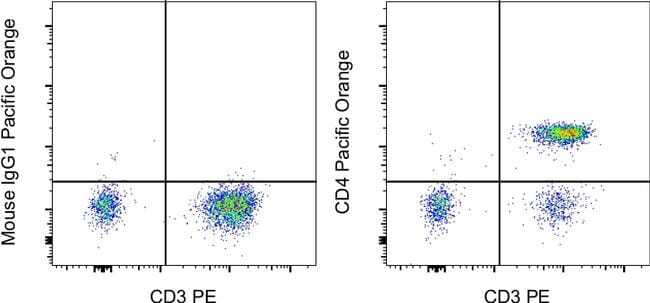 - Normal human peripheral blood cells were stained with CD3 Monoclonal Antibody, PE (Product # 12-0038-42) and Mouse IgG1 kappa Isotype Control, Pacific Orange (Product # 79-4714-81) (left) or CD4 Monoclonal Antibody, Pacific Orange (right). Cells in the lymphocyte gate were used for analysis.