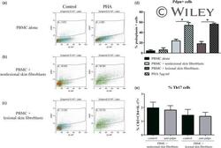 - Effect of interactions between skin fibroblasts and peripheral blood mononuclear cells (PBMC) on T helper type 17 (Th17) differentiation and interleukin (IL)-17 secretion. Healthy PBMC and psoriatic skin fibroblasts were cultured alone or in co-culture at a ratio of 5 : 1 for 48 h in the presence or absence of phytohaemagglutinin (PHA) (5 mug/ml). The Transwell system was used in co-cultures to inhibit cell-cell contact. PBMC were recovered after 48 h and stained with surface markers CD3 and CD4 and with intracellular IL-17A. The percentage of CD3 + CD4 + IL-17A + is represented (a,c). IL-17A production was measured in supernatants after 48 h by enzyme-linked immunosorbent assay (ELISA) (b,d). *Compares PBMC alone and co-cultures and # compares control and PHA (a,b). *Compares co-cultures and Transwell system (c,d). * P