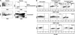 - 2. Quantification of human lymphocytes in thymus and spleen. (A) Isolated thymocytes were stained for anti-hCD4 and anti-hCD8 to characterize the distribution of single-positive, double-positive, and double-negative cell populations (images are representative of three mice/group). (B) Spleens were harvested at 8 weeks or 20 weeks postadoptive transfer, respectively. Splenocytes were stained for the human surface markers CD4, CD8, and CD19, and distribution was determined. One representative flow cytometry figure is shown for each stain. Table 1 indicates the number of investigated animals, the average percentage of positive cells for each stain, as well as the maximum and minimum percentage detected.