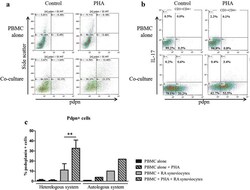 - Fig. 6 Expression of podoplanin in PBMC alone or in co-culture. Healthy PBMC were cultured alone or in co-culture with RA synoviocytes at a 5:1 ratio for 48 h, in the presence or absence of PHA (5 mug/ml). Cells were recovered after 48 h and stained for pdpn ( a and c ) or CD3, CD4, IL-17 and pdpn ( b ). Dot plot of one experiment is represented ( a and b ). The percentage of pdpn + cells in the different conditions is represented ( c ). * p