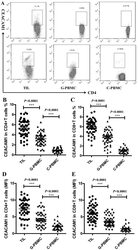 - Figure 1. Upregulated expression of CEACAM1 on T cells in patients with glioma. (A) Representative flow cytometric analysis results of TILs obtained from patients with glioma, PBMCs obtained from patients with glioma and control subjects. (B) Proportion of expression of CEACAM1 on CD4 + T cells in patients with glioma and in control subjects. (C) Percentage of expression of CEACAM1 on CD8 + T cells in patients with glioma and in control subjects. (D) MFI of CEACAM1 expression on CD4 + T cells in patients with glioma and in control subjects. (E) MFI of CEACAM1 expression on CD8 + T cells in patients with glioma and in control subjects. ***P