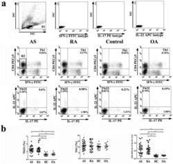 - Figure 1 Circulating Th22 cells and CD4 + IFNgamma - IL17 + IL-22 + T cells are significantly increased in ankylosing spondylitis (AS) patients and rheumatoid arthritis (RA) patients compared with osteoarthritis (OA) patients and healthy controls. a, Representative flow cytometry dot plots example of each group. b, The percentages of circulating Th22 cells (left panel), Th1 cells (middle panel) and CD4 + IFNgamma - IL17 + IL-22 + T cells (right panel) from AS, RA, OA patients and healthy controls after stimulation with phorbol myristate acetate, ionomycin, and monensin for 4 h. (* = P