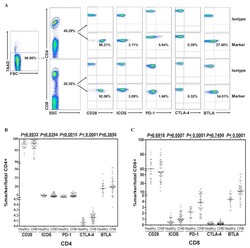 - Figure 1 Expression of CD28 family receptors on CD4 + and CD8 + T cells of patients with CHB. Peripheral blood mononuclear cells were isolated from healthy donors (n=26) or patients with CHB (n=52), and stained with anti-CD4, CD8, CD28, CTLA-4, PD-1, ICOS, BTLA or isotype control antibodies. Dead cells were excluded by 7-AAD staining. (A) Representative flow cytometric scatter plots of CD28 family receptors on peripheral CD4 + and CD8 + T cells from a patient with CHB. (B and C) Expression of CD28, CTLA-4, PD-1, ICOS and BTLA receptors. CD, cluster of differentiation; CHB, chronic hepatitis B; CTLA-4, cytotoxic T-lymphocyte-associated protein 4; PD-1, programmed cell death protein 1; ICOS, inducible T-cell co-stimulator; BTLA, B- and T-lymphocyte attenuator; 7-AAD, 7-aminoactinomycin D.