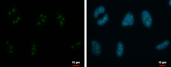 - ARIH2 antibody detects ARIH2 protein at nucleus by immunofluorescent analysis. Sample: HeLa cells were fixed in 4% paraformaldehyde/PBS for 15 min.Green: ARIH2 protein stained by ARIH2 antibody (GTX115410) diluted at 1:500.Blue: Hoechst 33342 staining.