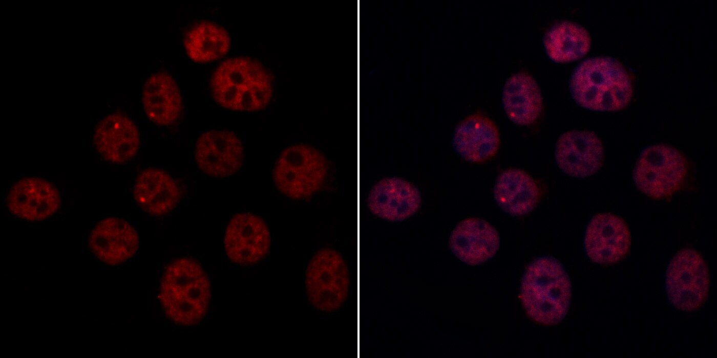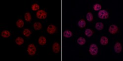- Immunocytochemistry analysis of ARIH2 in HeLa cells. Samples were treated with PFA, permeabilized in 0.1% Triton X-100, blocked in 10% serum (45 min at 25°C), and incubated with polyclonal antibody (Product # PA5-114879) at a dilution of 1:200 (1 hr at 37°C). Secondary staining was applied with Alexa Fluor 594 conjugated goat anti-rabbit IgG (red) using a dilution of 1:600.