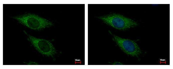 - OGDH antibody [C2C3], C-term detects OGDH protein at Mitochondria by immunofluorescent analysis. Sample: HeLa cells were fixed in -20¢J 100% MeOH for 5 min.Green: OGDH protein stained by OGDH antibody [C2C3], C-term (GTX105124) diluted at 1:500.Blue: Hoechst 33343 staining.