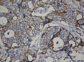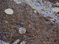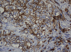 - IHC of paraffin-embedded Adenocarcinoma of Human breast tissue using anti-CDH1 mouse monoclonal antibody. (Heat-induced epitope retrieval by 10mM citric buffer, pH6.0, 120°C for 3min).