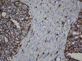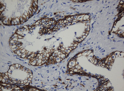 - IHC of paraffin-embedded Adenocarcinoma of Human colon tissue using anti-CDH1 mouse monoclonal antibody. (Heat-induced epitope retrieval by 10mM citric buffer, pH6.0, 120°C for 3min).