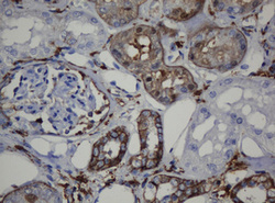 - IHC of paraffin-embedded Human Kidney tissue using anti-CDH1 mouse monoclonal antibody. (Heat-induced epitope retrieval by 10mM citric buffer, pH6.0, 120°C for 3min).
