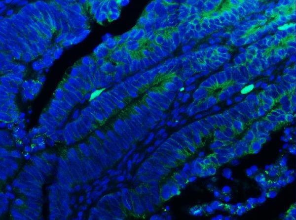 - Immunohistochemical analysis of E Cadherin using anti-E Cadherin antibody (Product # PA5-95278) E Cadherin was detected in paraffin-embedded section of mouse colon tissue. Heat mediated antigen retrieval was performed in citrate buffer (pH6, epitope retrieval solution) for 20 mins. The tissue section was blocked with 10% goat serum. The tissue section was then incubated with 5μg/mL rabbit anti-E Cadherin antibody (Product # PA5-95278) overnight at 4°C. DyLight®488 Conjugated Goat Anti-Rabbit IgG was used as secondary antibody at 1:100 dilution and incubated for 30 minutes at 37°C. The section was counterstained with DAPI. Visualize using a fluorescence microscope and filter sets appropriate for the label used.