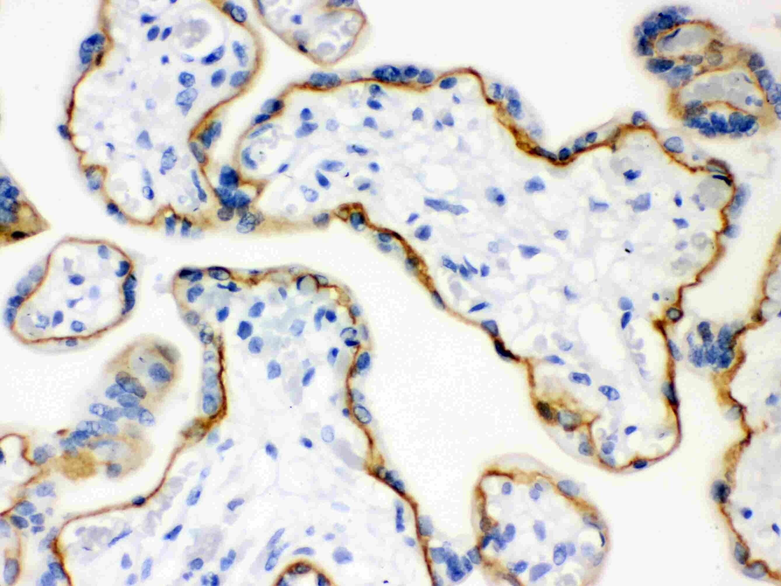 - Immunohistochemistry analysis of E-cadherin in human placenta tissue. Samples were incubated with E-cadherin polyclonal antibody (Product # PA5-95278).