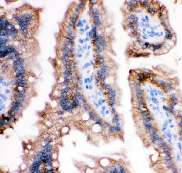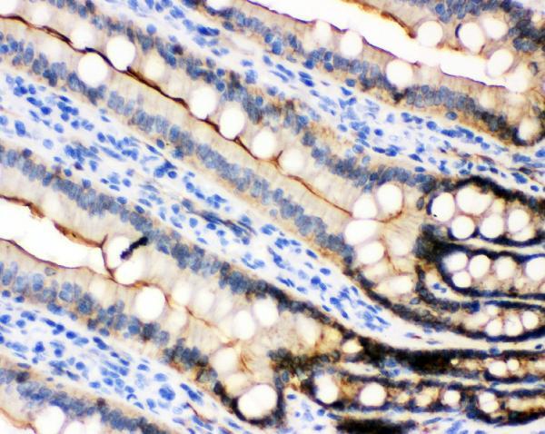 - Immunohistochemical analysis of E Cadherin in paraffin-embedded section of rat intestine tissues. Heat mediated antigen retrieval was performed in citrate buffer (pH6, epitope retrieval solution) for 20 mins. The tissue section was blocked with 10% goat serum. The tissue section was then incubated with 1μg/mL rabbit anti-E Cadherin antibody (Product # PA5-95278) overnight at 4°C. Biotinylated goat anti-rabbit IgG was used as secondary antibody and incubated for 30 minutes at 37°C. The tissue section was developed using Strepavidin-Biotin-Complex (SABC) with DAB as the chromogen.