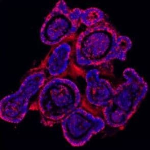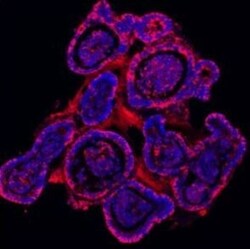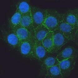- Immunocytochemistry analysis of E Cadherin using anti-E Cadherin antibody (Product # PA5-95278) . E Cadherin was detected in an immunocytochemical section of MCF-7 cells. Enzyme antigen retrieval was performed using IHC enzyme antigen retrieval reagent for 15 mins. The cells were blocked with 10% goat serum and then incubated with 5 μg/mL rabbit anti-E Cadherin antibody (Product # PA5-95278) overnight at 4°C. DyLight®488 Conjugated Goat Anti-Rabbit IgG was used as secondary antibody at 1:100 dilution and incubated for 30 minutes at 37°C. The section was counterstained with DAPI. Visualize using a fluorescence microscope and filter sets appropriate for the label used.