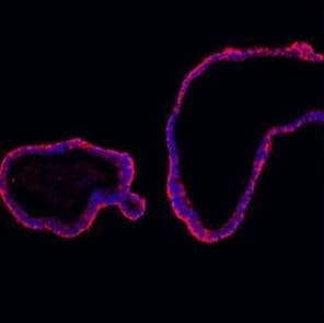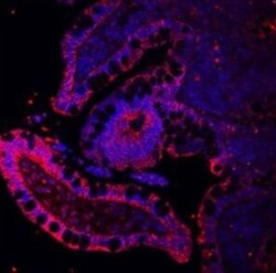 - Immunohistochemical analysis of E Cadherin in paraffin-embedded section of mouse ileum organoid tissue. Heat mediated antigen retrieval was performed in citrate buffer (pH6, epitope retrieval solution) for 20 mins. The tissue section was blocked with 10% goat serum. The tissue section was then incubated with 5μg/mL rabbit anti-E Cadherin antibody (Product # PA5-95278) overnight at 4°C. Cy3 Conjugated Goat Anti-Rabbit IgG was used as secondary antibody at 1:100 dilution and incubated for 30 minutes at 37°C. The section was counterstained with DAPI. Visualize using a fluorescence microscope and filter sets appropriate for the label used.