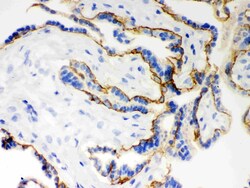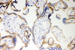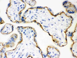 - Immunohistochemical analysis of E Cadherin in frozen section of human placenta tissues. The tissue section was blocked with 10% goat serum. The tissue section was then incubated with 1μg/mL rabbit anti-E Cadherin antibody (Product # PA5-95278) overnight at 4°C. Biotinylated goat anti-rabbit IgG was used as secondary antibody and incubated for 30 minutes at 37°C. The tissue section was developed using Strepavidin-Biotin-Complex (SABC) with DAB as the chromogen.