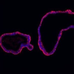 - Immunohistochemistry (Paraffin) analysis of E-cadherin in paraffin-embedded section of human colon organoid tissue using E-cadherin Polyclonal Antibody (Product # PA5-95278). Heat mediated antigen retrieval was performed in citrate buffer (pH6, epitope retrieval solution ) for 20 mins. The tissue section was blocked with 10% goat serum. The tissue section was then incubated with the primary antibody at a 5 µg/mL dilution overnight at 4°C. Cy3 conjugated goat anti-rabbit IgG was used as secondary antibody at 1:100 dilution and incubated for 30 minutes at 37°C. The section was counterstained with DAPI. Visualize using a fluorescence microscope and filter sets appropriate for the label used.
