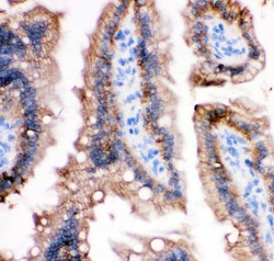 - Immunohistochemical analysis of E Cadherin in frozen section of rat intestine tissues. The tissue section was blocked with 10% goat serum. The tissue section was then incubated with 1μg/mL rabbit anti-E Cadherin antibody (Product # PA5-95278) overnight at 4°C. Biotinylated goat anti-rabbit IgG was used as secondary antibody and incubated for 30 minutes at 37°C. The tissue section was developed using Strepavidin-Biotin-Complex (SABC) with DAB as the chromogen.