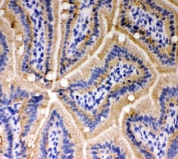 - Immunohistochemical analysis of E Cadherin in paraffin-embedded section of mouse intestine tissue. Heat mediated antigen retrieval was performed in citrate buffer (pH6, epitope retrieval solution) for 20 mins. The tissue section was blocked with 10% goat serum. The tissue section was then incubated with 1μg/mL rabbit anti-E Cadherin antibody (Product # PA5-95278) overnight at 4°C. Biotinylated goat anti-rabbit IgG was used as secondary antibody and incubated for 30 minutes at 37°C. The tissue section was developed using Strepavidin-Biotin-Complex (SABC) with DAB as the chromogen.