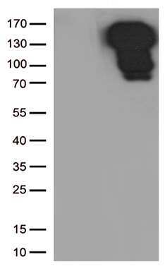 - HEK293T cells were transfected with the pCMV6-ENTRY control (Left lane) or pCMV6-ENTRY CDH1(RC220731, Right lane) cDNA for 48 hrs and lysed. Equivalent amounts of cell lysates (5 µg per lane) were separated by SDS-PAGE and immunoblotted with anti-CDH1. (1:500)