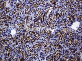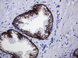 - Immunohistochemical staining of paraffin-embedded Carcinoma of Human prostate tissue using anti-CDH1 mouse monoclonal antibody. (Heat-induced epitope retrieval by 10mM citric buffer, pH6.0, 120°C for 3min, TA800691)