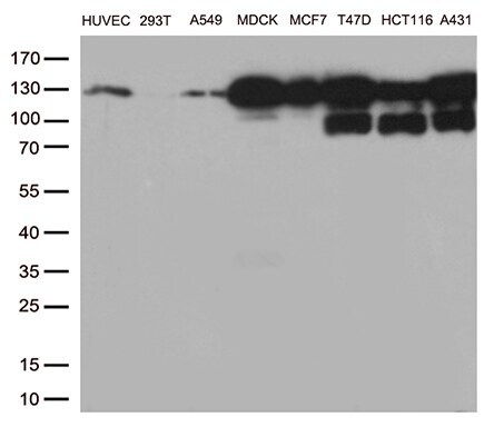 - Western blot analysis of extracts (35 µg) from 8 cell lines lysates by using anti-CDH1 monoclonal antibody. (1:500)