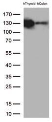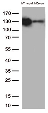 - Western blot analysis of extracts (35 µg) from 2 tissue lysates by using anti-CDH1 monoclonal antibody. (1:500)