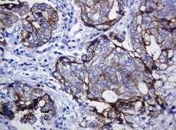 - Immunohistochemical staining of paraffin-embedded Adenocarcinoma of Human breast tissue using anti-CDH1 mouse monoclonal antibody. (Heat-induced epitope retrieval by 10mM citric buffer, pH6.0, 120°C for 3min, TA800691)
