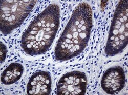 - Immunohistochemical staining of paraffin-embedded human colon tissue within the normal limits using anti-CDH1 mouse monoclonal antibody. (Heat-induced epitope retrieval by 10mM citric buffer, pH6.0, 120°C for 3min, TA800691)