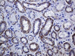 - Immunohistochemical staining of paraffin-embedded human Kidney tissue within the normal limits using anti-CDH1 mouse monoclonal antibody. (Heat-induced epitope retrieval by 10mM citric buffer, pH6.0, 120°C for 3min, TA800691)
