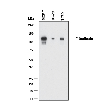 - Detection of Human E-Cadherin by Western Blot. Western blot shows lysates of MCF-7 human breast cancer cell line, BT-20 human breast cancer cell line, and T47D human breast cancer cell line. PVDF membrane was probed with 2 µg/mL of Mouse Anti-Human E-Cadherin Monoclonal Antibody (Catalog # MAB18381) followed by HRP-conjugated Anti-Mouse IgG Secondary Antibody (Catalog # HAF018). A specific band was detected for E-Cadherin at approximately 120 kDa (as indicated). This experiment was conducted under reducing conditions and using Immunoblot Buffer Group 1.