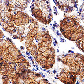 - E-Cadherin in Human Stomach. E-Cadherin was detected in immersion fixed paraffin-embedded sections of human stomach using Mouse Anti-Human E-Cadherin Monoclonal Antibody (Catalog # MAB18381) at 5 µg/mL for 1 hour at room temperature followed by incubation with the Anti-Mouse IgG VisUCyte™ HRP Polymer Antibody (Catalog # VC001). Tissue was stained using DAB (brown) and counterstained with hematoxylin (blue). Specific staining was localized to plasma membrane. View our protocol for Chromogenic IHC Staining of Paraffin-embedded Tissue Sections.