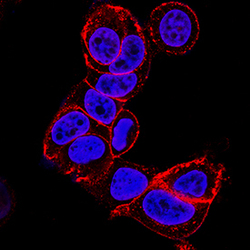 - E-Cadherin in MCF-7 Human Cell Line. E-Cadherin was detected in immersion fixed MCF-7 human breast cancer cell line using Mouse Anti-Human E-Cadherin Monoclonal Antibody (Catalog # MAB18381) at 3 µg/mL for 3 hours at room temperature. Cells were stained using the NorthernLights™ 557-conjugated Anti-Mouse IgG Secondary Antibody (red; Catalog # NL007) and counterstained with DAPI (blue). Specific staining was localized to cell membrane. View our protocol for Fluorescent ICC Staining of Cells on Coverslips.
