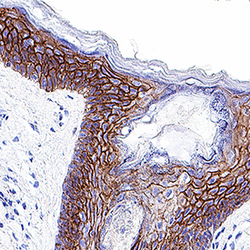 - E-Cadherin in Human Skin. E-Cadherin was detected in immersion fixed paraffin-embedded sections of human skin using Mouse Anti-Human E-Cadherin Monoclonal Antibody (Catalog # MAB18381) at 0.5 µg/mL for 1 hour at room temperature followed by incubation with the Anti-Mouse IgG VisUCyte™ HRP Polymer Antibody (Catalog # VC001). Tissue was stained using DAB (brown) and counterstained with hematoxylin (blue). Specific staining was localized to plasma membrane. View our protocol for Chromogenic IHC Staining of Paraffin-embedded Tissue Sections.