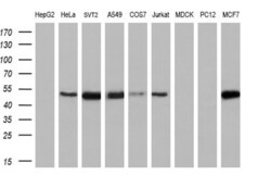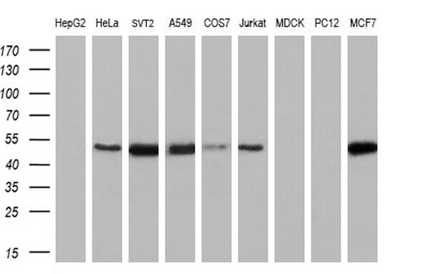 - Western blot analysis of extracts (35 µg) from 9 different cell lines by using anti-CCM2 monoclonal antibody (HepG2: human; HeLa: human; SVT2: mouse; A549: human; COS7: monkey; Jurkat: human; MDCK: canine; PC12: rat; MCF7: human). (1:200)