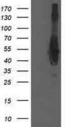 - HEK293T cells were transfected with the pCMV6-ENTRY control (Left lane) or pCMV6-ENTRY CCM2 (RC201418, Right lane) cDNA for 48 hrs and lysed. Equivalent amounts of cell lysates (5 µg per lane) were separated by SDS-PAGE and immunoblotted with anti-CCM2. Positive lysates LY410516 (100 µg) and LC410516 (20 µg) can be purchased separately from OriGene.