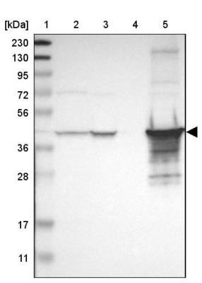 - Western Blot: ACAT1 Antibody [NBP1-89284] - Lane 1: Marker [kDa] 230, 130, 95, 72, 56, 36, 28, 17, 11. Lane 2: Human cell line RT-4. Lane 3: Human cell line U-251MG sp. Lane 4: Human plasma (IgG/HSA depleted). Lane 5: Human liver tissue