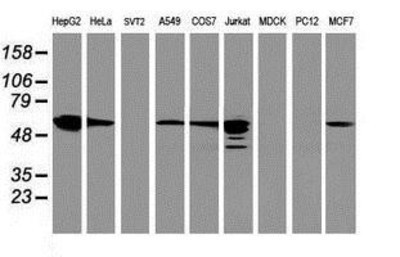 - Western Blot: FDFT1 Antibody (2F10) [NBP2-01170] Analysis of extracts (35ug) from 9 different cell lines by using anti-FDFT1 monoclonal antibody.