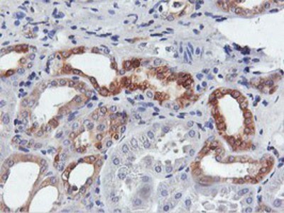 - Immunohistochemistry-Paraffin: FDFT1 Antibody (2F10) [NBP2-01170] - Staining of paraffin-embedded Human Kidney tissue using anti-FDFT1 mouse monoclonal antibody.