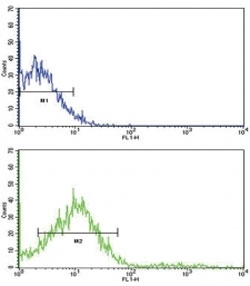 - Flow cytometric analysis of NCI-H292 cells using ROR2 antibody (green) compared to a negative control (blue). FITC-conjugated goat-anti-rabbit secondary Ab was used for the analysis.