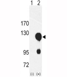 - Western blot analysis of ROR2 antibody and 293 cell lysate either nontransfected (Lane 1) or transiently transfected with the ROR2 gene (2).