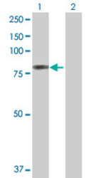 - Western Blot analysis of EPB41L2 expression in transfected 293T cell line (H00002037-T01) by EPB41L2 MaxPab polyclonal antibody.Lane 1: EPB41L2 transfected lysate(69.63 KDa).Lane 2: Non-transfected lysate.