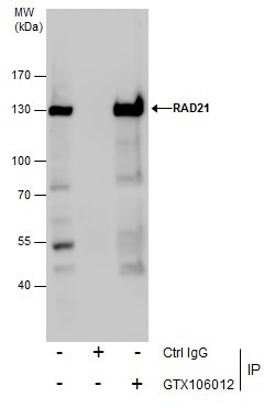 - Immunoprecipitation of RAD21 protein from Jurkat whole cell extracts using 5 £gg of RAD21 antibody (GTX106012).Western blot analysis was performed using RAD21 antibody (GTX106012).EasyBlot anti-Rabbit IgG (GTX221666-01) was used as a secondary reagent.