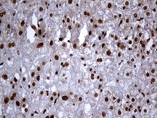 - Immunohistochemical staining of paraffin-embedded Human liver tissue within the normal limits using anti-RAD21 mouse monoclonal antibody.(Heat-induced epitope retrieval by 1mM EDTA in 10mM Tris buffer (pH8.5) at 120°C for 3 min, TA811221)(1:2000)