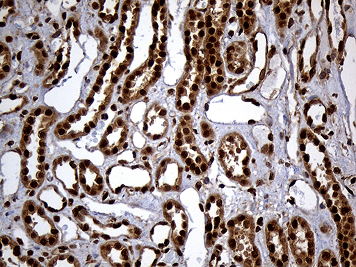 - Immunohistochemical staining of paraffin-embedded Human Kidney tissue within the normal limits using anti-RAD21 mouse monoclonal antibody. (Heat-induced epitope retrieval by 1mM EDTA in 10mM Tris buffer (pH8.5) at 120°C for 3 min, TA811221)(1:2000)