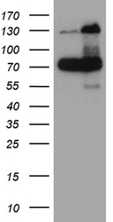 - HEK293T cells were transfected with the pCMV6-ENTRY control (Left lane) or pCMV6-ENTRY RAD21 (RC208262, Right lane) cDNA for 48 hrs and lysed. Equivalent amounts of cell lysates (5 ug per lane) were separated by SDS-PAGE and immunoblotted with anti-RAD21.(1:2000)