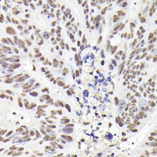 - Immunohistochemistry analysis of RAD21 in paraffin-embedded human colon carcinoma. Samples were incubated with RAD21 Polyclonal antibody (Product # PA5-120663) using a dilution of 1:200 (40x lens). Perform high pressure antigen retrieval with 10 mM citrate buffer pH 6.0 before commencing with IHC staining protocol.
