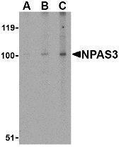 - Western blot analysis of NPAS3 in rat brain tissue lysate with NPAS3 antibody at (A) 0.5, (B) 1 and (C) 2 ug/ml.