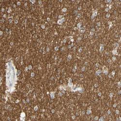 - Immunohistochemical staining of human cerebral cortex shows distinct positivity in neuropil.